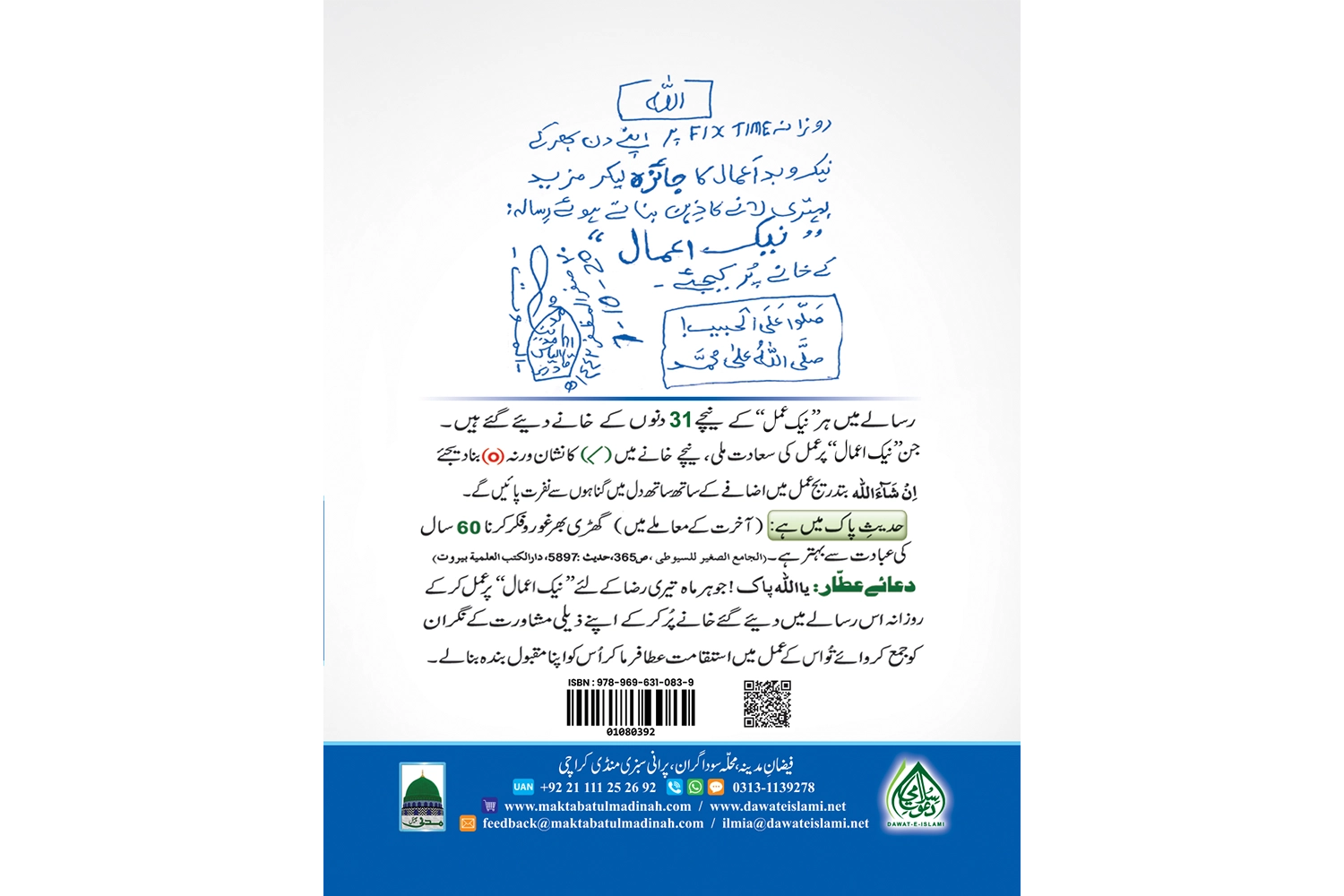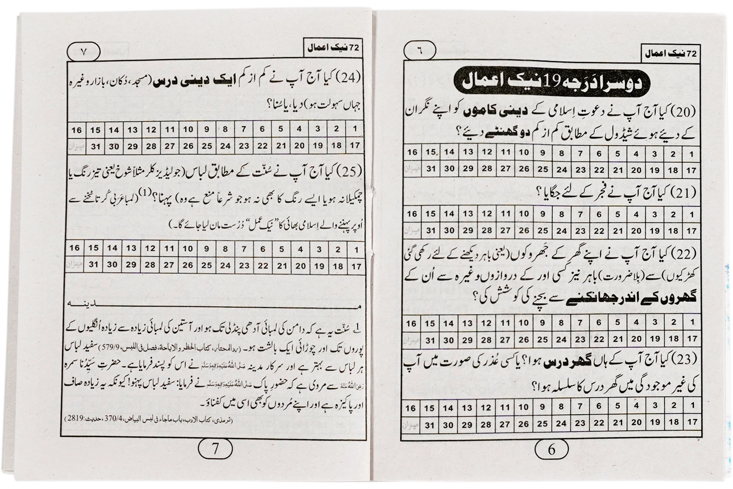 اپنے روزمرہ کے معمولات کا محاسبہ کرنا بے حد ضروری ہے کیونکہ اسی محاسبے سے آپ اپنی زندگی کو بہتر بنا سکتے ہیں۔ ہمارے بزرگانِ دین اور اسلاف کا بھی یہی معمول تھا۔ محاسبے کے اس عمل کو آسان اور منظم بنانے کے لیے آپ کی خدمت میں پیش ہے مکتبۃ المدینہ کا شائع کر دہ رسالہ ’’72 نیک اعمال ‘‘ ۔"72 نیک اعمال " کا یہ رسالہ خصوصاً اسلامی بھائیوں کے لیے مرتب کیا گیا ہے ۔ اس رسالے کے ذریعے امیر اَہلسنّت دامت برکاتہم العالیہ نے نفس و شیطان کے دھوکے اور فریب سے بچنے کا ایک بڑا ہی آسان طریقہ متعارف کروایاہے ۔ اس سالہ میں روز مرہ کے معمولات سے متعلق مختلف سوالات ہیں یعنی نماز، درود پاک ، تلاوت قرآن وغیرہ، جن کے جوابات روزانہ دینے ہوتے ہیں اور مہینے کے آخر میں یہ رسالہ دعوت اسلامی کے ذ مہ داراسلامی بھائی کے پاس جمع کروایا جاتاہے۔ اس رسالے میں مدنی انعامات کی تقسیم کچھ یوں ہے: یومیہ56 نیک اعمال ، ہفتہ وار 10نیک اعمال، ماہانہ 3 نیک اعمال ،سالانہ 1 نیک عمل ، زندگی بھر کے2 نیک اعمال نیزاس میں قفل مدینہ کی کارکردگی بھی شامل ہے ۔ اس رسالے کو روزانہ ایمان داری سے پُر کر کے کوئی بھی شخص اپنے اعمال کا جائزہ لے سکتا ہے کہ اس کے اعمال اچھے ہیں یا بُرے ، وہ کتنا اسلامی تعلیمات پر عمل کر رہا ہے اور وہ کہاں کوتاہی کر رہا ہے ۔ اس رسالے کا مقصد یہی ہے کہ اگر کبھی کوئی شخص اپنا محاسبہ کرتے ہوئے اپنی معمولات میں نیکیوں کی کمی اور گناہوں کی زیادتی پائے تو اللہ عَزَّ وَجَلَّ سے ڈرے اور گناہوں سے توبہ کرتے ہوئے نیکیوں میں کثرت کی کوشش کرے کہ گناہ کے بعد نیکی کرنا گناہ کو مٹا دیتا ہے۔حدیث پاک میں ہے کہ آخرت کے معاملے میں گھڑی بھر غور و فکر کرنا 60 سال کی عبادت سے بہتر ہے۔(الجامع الصغیر للسیوطی) ۔ نیک اعمال پر کرنے والے کے لیے امیر اہل سنت کی دعا ہے کہ یا اللہ عز و جل جو تیری رضا کے لئے نیک اعمال پر عمل کر کے روزانہ اس رسالے میں دیے گئے خانے پر کر کے ہر ماہ اپنے ذیلی مشاورت نگران کو جمع کروائے تو اس کو عمل میں استقامت عطافرما کر اُس کو اپنا مقبول بندہ بنالے۔ اپنے اعمال کا محاسبہ کرنے ،نیکیوں کی طرف راغب ہونے اور گناہوں کی عادت چھوڑنے کے لیے ’’نیک اعمال‘‘ کو پر کرنے کی عادت بنائیں ۔’’نیک اعمال‘‘ اب تک لاکھوں مسلمانوں کی زندگیوں میں تبدیلیاں لانے کا سبب بن چکا ہے ۔
