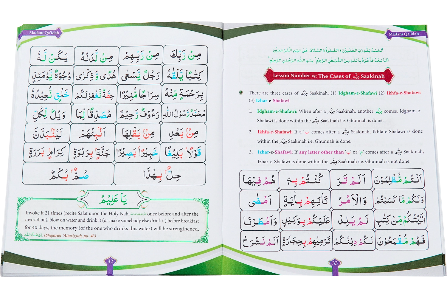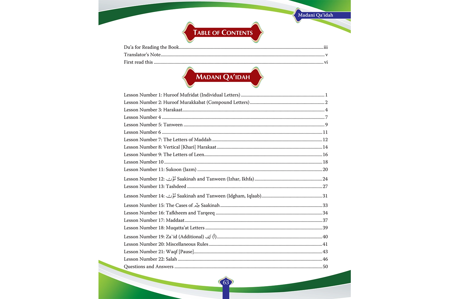 ’’مدنی قاعدہ ‘‘ قرآن پاک کوصحیح مخارج کے ساتھ پڑھنے کے لیے ایک بنیادی اور ضروری کتاب ہے۔ اسی ضرورت کے پیشِ نظر مکتبۃ المدینہ نے اسے اردو کے بعد اب انگلش زبان میں بھی شائع کیا ہے۔ اس انگلش مدنی قاعدے میں الفاظ کو مختلف کلرز میں لکھا گیا ہے اور فونٹ بھی بڑا استعمال کیا گیا ہےاور پیپر بھی اچھی کوالٹی کا استعمال کیا گیا ہے۔ اسے خاص طور پر بچوں کے لیے بنایا گیا ہے لیکن یہ بڑوں کے لیے بھی اتنا ہی مفید ہے۔ اس قاعدے میں قرآن پاک درست مخارج کے ساتھ پڑھنے کے حوالے سے بنیادی قواعدو معلومات کو بہت ہی آسان انداز میں بیان کیا گیا ہے۔ اس میں چھوٹی اور بڑی عمر کے طلبہ وطالبات کیلئے تجوید کے بنیادی قواعد حتی الامکان آسان انداز میں پیش کئے گئے ہیں تاکہ بچے، بچیاں،اسلامی بھائی اور اسلامی بہنیں آسانی سے درست قرآن پاک پڑھنا سیکھ جائیں ۔ اس قاعدے میں ابتداء تمام حروف کے مخارج بیان کیے گئے ہیں۔ اور پھر 22 اسباق ہیں۔ جن میں حروف تہجی، مفردات ومرکبات، حرکات و تنوین، حروف مدہ و حروف لین، کھڑی حرکات، نون ساکن و میم ساکن کے قواعد، تفخیم و ترقیق کے قواعد، مدات اور نون قطنی وغیرہ کا بیان ہے۔ ہر سبق کے آغاز میں اس سبق سے متعلق قواعد کو بہت آسان الفاظ و انداز میں بیان کیا گیا ہے ۔ اوربچوں کی آسانی کے لیے تمام قواعد کو بہ آسانی یاد کے لیے آخر میں 82 سوالات و جوابات الگ سے دیے گئے ہیں۔ قرآن پاک کو درست مخارج و تجوید کے ساتھ پڑھنے کے لیے اس قاعدے کو خریدیں اور دوسروں کو بھی تحفہ دے کر ثواب دارین حاصل کریں ۔ مدنی قاعدہ کو پڑھانے کے لیے قاری صاحبان کے لیےمکتبۃ المدینہ نے "رہنمائے مدرسین" اور قرآن پاک حفظ و ناظرہ پڑھانے کے لئے "قرآن سیکھیں اور سیکھائیں" کتب بھی شائع کی ہیں۔ وہ ممالک جہاں انگلش بولی جاتی ہے یا وہ بچے جن کی انگلش اچھی ہے ان کے لیے یہ قاعدہ بے حد مفید ہے۔