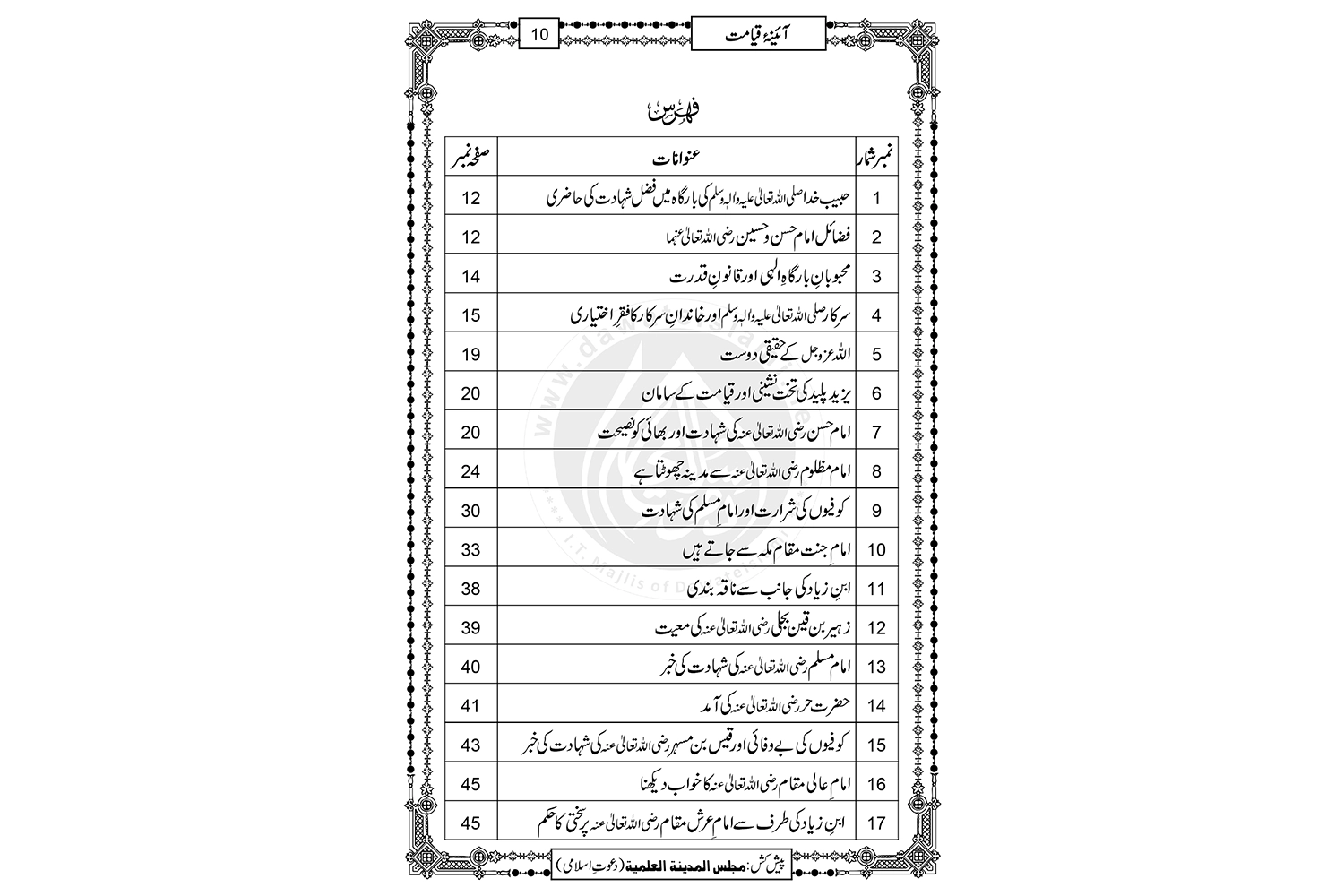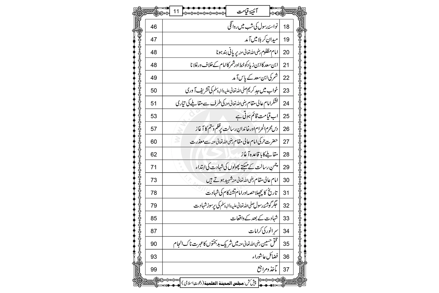واقعہ کربلا کےمتعلق محررین وعلمائے کرام نے متعدد کتابیں لکھیں ،جن میں سے بعض نے بہت پذیرائی حاصل کی اور انہی میں سے ایک کتاب ’’ آئینۂ قیامت ‘‘ہے ۔ یہ شہنشاہ سخن، استاذِ زمن، برادرِ اعلی حضرت مولانا حسن رضا خان علیہ رحمۃ المنان کی تصنیف ہے اور اسکے بارے میں مفتی اعظم ہند ابو البرکات محمد مصطفی رضا خان علیہ رحمۃ الرحمن ’’ الفتاوی المصطفویۃ ‘‘ میں تحریر فرماتے ہیں : ’’ آ ئینۂ قیامت‘‘ تصنیف حضرت عمی جناب استاد زمن مولانا حسن رضا خاں صاحب حسنؔ رحمہ اللہ تعالٰی ،یہ کتاب اعلیٰ حضرت قدس سرہ کی دیکھی اور مجالس میں کتنی ہی بار سنی ہوئی ہے۔ (الفتاویٰ المصطفویۃ،ص۴۶۳) خود اعلیٰ حضرت مولانا امام احمد رضا خان علیہ الرحمہ سے جب ذکرِ شہادت سے متعلق سوال کیا گیا تو آپ نے جواباً ارشاد فرمایا: ’’مولانا شاہ عبدالعزیز صاحب کی کتاب جو عربی میں ہے وہ یا حسن میاں مرحوم میرے بھائی کی کتاب ’’ آئینۂ قیامت ‘‘میں صحیح روایات ہیں انہیں پڑھناو سننا چاہیے، باقی غلط روایات کے پڑھنے سے نہ پڑھنا اور نہ سننا بہت بہتر ہے۔‘‘ (ملفوظات اعلی حضرت،حصہ دوم،ص۲۹۳) مکتبۃ المدینہ کی شائع کردہ اس کتاب کی چند خصوصیات یہ ہیں: (١) متعدد نسخوں سے تقابل (٢) جدید کمپیوٹر کمپوزنگ (٣) نئے عنوانات کا اضافہ (٤) احادیث و روایات کی تخریج (٥) مفید و ضروری حواشی (٦) کتابت کے اختلافی مقامات کی تصحیح (٧) اور اخیرمیں فیضانِ سنت (جلداوّل) سے فضائلِ عاشورہ شامل کئے گئے ہیں۔ یوں مکتبۃ المدینہ کی شائع کردہ ”آئینۂ قیامت“ بہت سی خوبیوں سے آراستہ ہے ۔ لہذا خود بھی خریدکر مطالعہ کیجئے اور دوسرے اسلامی بھائیوں کو بھی اس کے پڑھنے کی ترغیب دلائیے۔