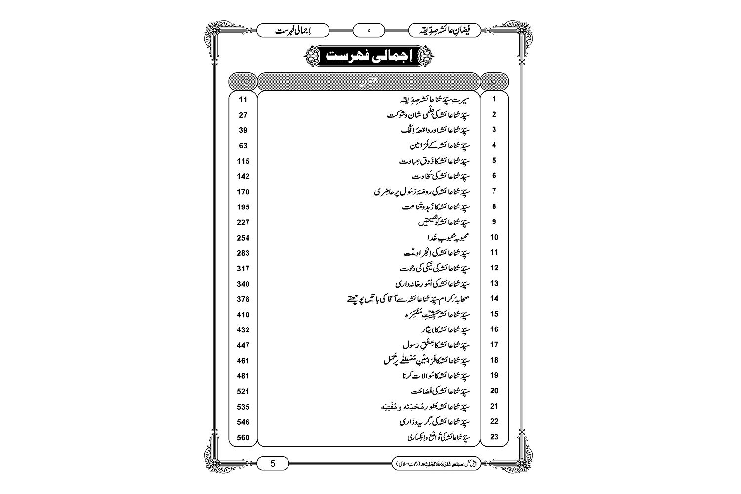 ازواج مطہرات میں سے حضرت عائشہ صدیقہ رضی اللہ عنہا کو کئی اعتبار سے خصوصیت حاصل ہے۔ آپ صحابہ کرام کےمابین علمی وسعت کے اعتبار سے بھی ایک امتیازی شان رکھتی ہیں۔ حضور اکرم صلی اللہ علیہ وسلم کی نجی زندگی کے احوال و معاملات کو امت تک آپ نے اس انداز میں پہنچایا کہ کوئی گوشہ نا مکمل نہیں رہا۔ یہ کتاب "فیضانِ عائشہ صدیقہ رضی اللہ تعالٰی عنہا "آپ کی سیرت کے انہی پہلوؤں کا احاطہ کرتی ہے ۔ 608 صفحات پر مشتمل یہ کتاب ام المؤمنین حضرت عائشہ صدیقہ رضی اللہ عنہا کی سیرت پر لکھی گئی اردو زَبان کی جامِع ترین کتاب ہے۔ اس کتاب کی خصوصیات درج ذیل ہیں: (١) اس کتاب میں حضرت عائشہ رضی اللہ تعالٰی عنہا کی سیرتِ پاک کو 23 عنوانات کے تحت قراٰن و حدیث اور محدّثین کی وضاحت کی روشنی میں مُدَلَّل انداز میں بیان کیا گیا ہے۔ جن میں آپ کا ذوقِ عِبَادت، عشقِ رسول، تواضع و انکساری، بطور مُفَسِّرہ، محدثہ اور مُفْتِیہ آپ کی سیرت، آپ کا نیکی کی دعوت دینا اور بُرائی سے منع کرنا اور آپ کے اُمورِ خانہ داری وغیرہ شامِل ہیں۔ (٢)حضرتِ عائشہ صدیقہ رضی اللہ تعالٰی عنہا کی مُبَارَک زِندگی کا اہم اور تاریخی واقعہ ”واقعۂ افک“ ہے، جس کا بیان قراٰنِ مجید، پارہ 18 سورۃ النّور کی آیات میں مفصّل طور پر ہوا ہے، یہ واقعہ اور اس کے تاریخی حقائق کو بطورِ خاص کتاب میں شامل کیا گیا ہے (٣) اس کے عِلاوہ 46 حِکَایات اور عقائد و اعمال کی اصلاح کے بہت سارے مضامین بھی ضِمناً ذِکر ہوئے ہیں۔ (٤) یہ کتاب بطورِ خاص اسلامی بہنوں کے لئے تحریر کی گئی ہے۔ لیکن اسلامی بھائیوں کے لئے بھی بہت مفید ہے۔ (5) اس کتاب میں سیدہ عائشہ صدیقہ رضی اللہ عنہا کے بارے میں صِرف معلومات دینے پر اکتفا نہیں کیا گیا بلکہ اسلامی بہنوں کی اخلاقی اور عملی تربیَت کے لئے ان کی سیرت سے حاصِل ہونے والے مدنی پھول بھی ذِکر کئے گئے ہیں۔ (٦) زبان بہت سادہ اور آسان ہے تاکہ ہر ایک آسانی سے مطالعہ کر سکے۔