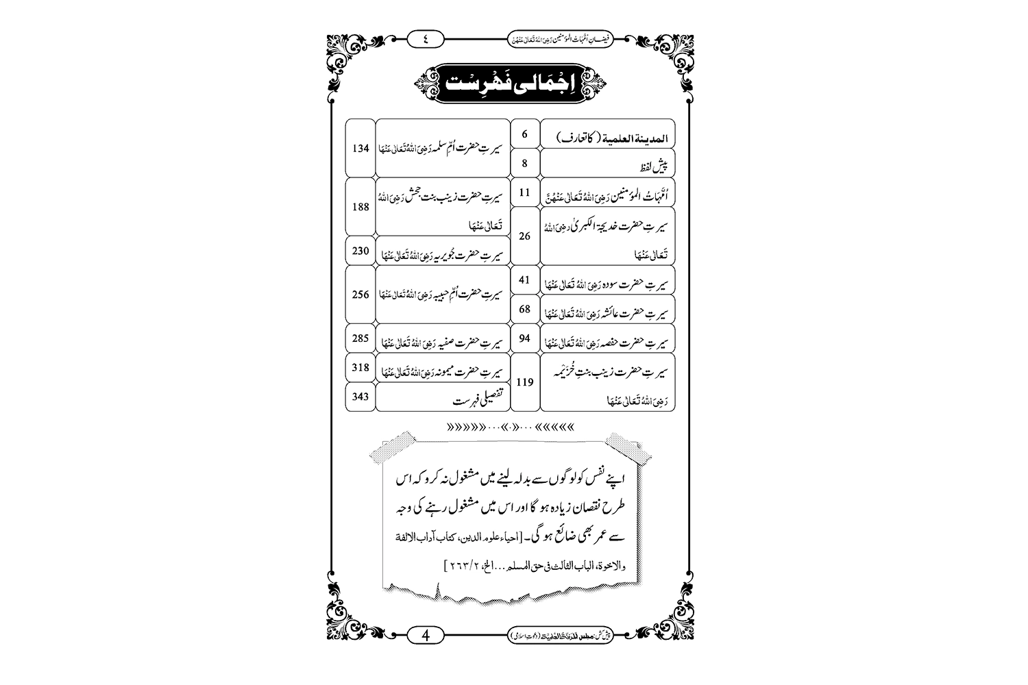 کتاب " فیضانِ امہات المؤمنین" پیارے آقاﷺ کی ازواجِ مطہرات کی سیرت اور فضائل و مناقب کے بارے میں ہے۔ وہ خوش نصیب خواتین جنہیں رسول اللہﷺ نے شرفِ زوجیت سے نوازا قرآن کریم نے انہیں مؤمنوں کی مائیں قرار دیا ہے ارشادِ باری تعالیٰ ہے، ترجمہ: یہ نبیﷺ مسلمانوں کے ان کی جانوں سے زیادہ مالک ہیں اور ان کی بیویاں ان کی مائیں ہیں۔ (سورۃ الاحزاب آیت :6) رب ذوالجلال نے اپنے پیارے رسولﷺ کی ازواج کو بہترین اوصاف سے نوازا تھا، احکام شرع کی پاسداری، تقوی و پرہیزگاری، زہد و عبادت الغرض ایسے بے شمار اوصاف جو انہیں دنیا جہاں کی سب عورتوں سے نمایاں اور اونچے مقام پر فائز کر دیتے ہیں۔اور یہ درحقیقت آپﷺ کی صحبت کا ہی اثر تھا کہ انہیں اس قدر بلند مقام و مرتبہ حاصل ہوا۔ امہات المومنین کی زندگیاں مسلمان خواتین کے لئے اسوہ اور نمونہ ہیں،لہذا مسلمان خواتین کے لیے ان کی سیرت کو جاننا ضروری ہے۔ اور یہ کتاب اس ضرورت کو پورا کرتی ہے۔ اس کتاب کو بارہ ابواب (chapters) میں تقسیم کیا گیا ہے۔ پہلا باب اجتماعی طور پر تمام امہات المؤمنین رضی اللہ تعالیٰ عنھن کے فضائل پر مشتمل ہے اور بقیہ گیارہ ابواب بالترتیب گیارہ امہات المؤمنین حضرت خدیجہ، حضرت سودہ، حضرت عائشہ، حضرت حفصہ ،حضرت زینب بنت خزیمہ، حضرت امّ سلمہ ، حضرت زینب بنت جحش، حضرت جویریہ، حضرت امّ حبیبہ، حضرت صفیہ اور حضرت میمونہ رضی اللہ تعالی عنھن کی سیرت طیبہ پر مشتمل ہیں۔ اس کتاب کے مطالعہ سے مسلمانوں کے دلوں میں امہات المؤمنین کا مقام و مرتبہ اور ان کی عظمت مزید اُجاگر ہوگی اور بالخصوص خواتین میں عمل کا جذبہ بیدار ہوگا۔