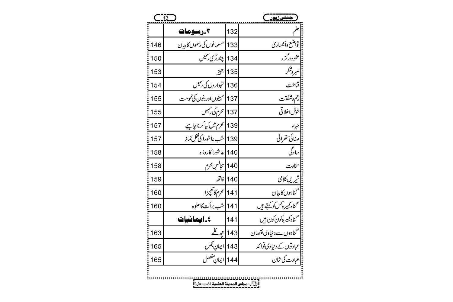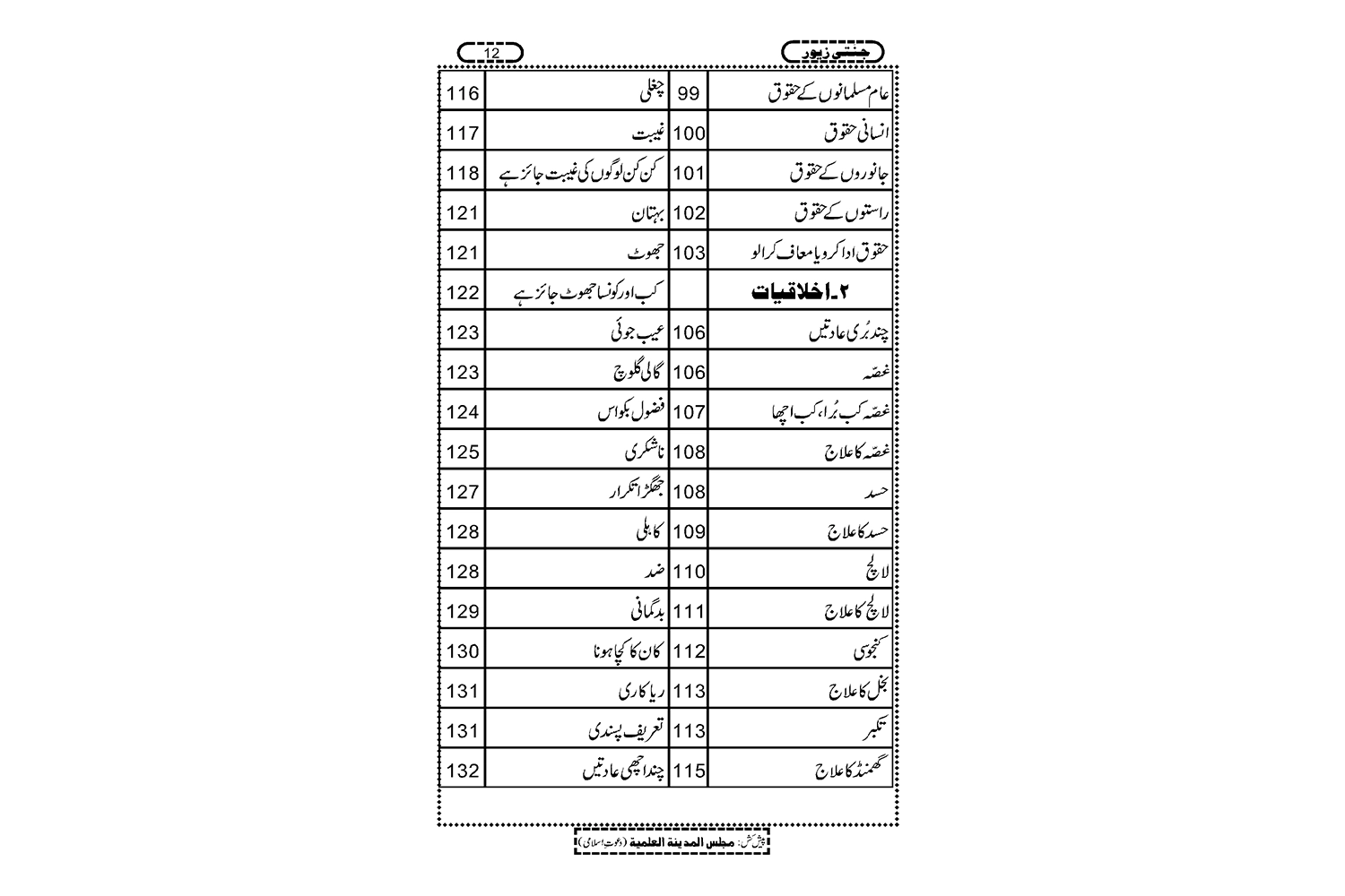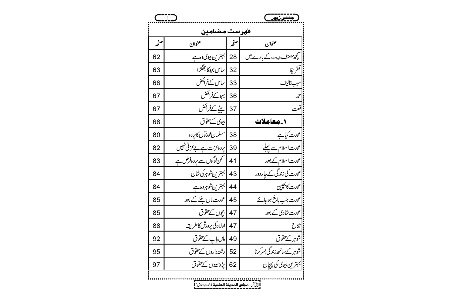 یہ کتاب "جنتی زیور" اسلامی بہنوں کو اسلامی عقائد ومسائل سے روشناس کروانے کے لیے شیخ الحدیث علامہ عبد المصطفیٰ اعظمی علیہ الرحمہ نے ترتیب دی ہے جسے "المدینۃ العلمیہ" نے جدید دور کے تقاضوں کے مطابق شائع کیا ہے ۔اس کتاب میں زندگی کے تمام ہی شعبہ جات کا بہت ہی خوبصورتی سے احاطہ کیا گیا ہے اور ہر شعبہ جات سے متعلق وہ تمام اہم مسائل مذکورہیں جو موجودہ زمانہ کے لحاظ سے خواتین کے لیے بہت ضروری ہیں۔ کتاب کو درج ذیل Chapters میں تقسیم کیا گیا ہے۔ 1 - معاملات : اس میں عورت کیا ہے، نکاح، میاں بیوی کے آپس میں حقوق ، ماں باپ کے حقوق، رشتہ داروں کے حقوق، پڑوسیوں کے حقوق، انسانی حقوق اور جانوروں کے حقوق سے متعلق احکامات موجود ہیں۔ 2- اخلاقیات: اس میں غصہ ، حسد، لالچ، تکبر، گھمنڈ، چغلی، غیبت، بہتان، جھوٹ ، عیب جوئی، گالی گلوچ، ناشکری ریاکاری ، علم، قناعت، گناہوں کا بیان اور عبادتوں کے فوائد موجود ہیں۔ 3- رسومات: اس میں مسلمانوں کی رسمیں، بُری رسمیں، تہوار، محرم کی رسومات، وغیرہ ذکر کی گئی ہیں۔ 4- ایمانیات:اس میں 6 کلمے، ایمانِ مفصل و مجمل، عقیدہ توحید، انبیاء، فرشتوں، جنوں، آسمانی کتابیں،تقدیر، برزخ، قیامت کفر، ولایت، پیری مریدی کا بیان موجود ہے۔ 5 - عبادات: اس میں نماز، روزہ، زکوٰۃ، حج، اور ان کے مسائل و احکام موجود ہیں۔ 6- اسلامیات: اس میں کھانے، پینے، سلام، لباس، بات چیت کے آداب، ایصال ثواب و فاتحہ کے بارے میں احکامات موجود ہیں۔ 7- تذکرہ صالحات: اس chapter میں امہات المؤمنین، بنات رسول اللہ صلی اللہ علیہ وسلم اور بہت سی صحابیات کا ذکر خیر موجود ہے۔ 8- متفرق ہدایات: اس عنوان کے تحت دستکاری اور پیشوں کا بیان، آداب سفر، زمانہ حمل کی احتیاط و تدابیر موجود ہیں۔ 9- عملیات: یہ بہت اہم باب ہے جس میں روحانی امراض ، جادو آسیب، نظر بد، اور سورتوں کے خواص موجود ہیں۔ آخر میں نعتیں، شجرہ قادریہ اور مناجات بھی موجود ہیں۔ الغرض ہر عنوان کے تحت ضروری ہدایات اور مسائل کا کافی حد تک ذخیرہ موجود ہے اس لئے یہ کتاب ہر گھر اور ہر عورت کی ضرورت ہے۔