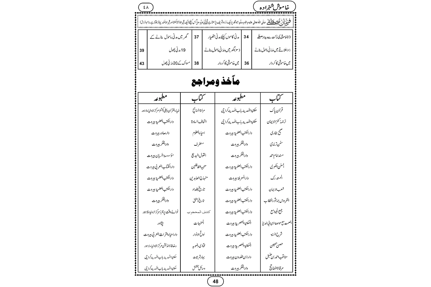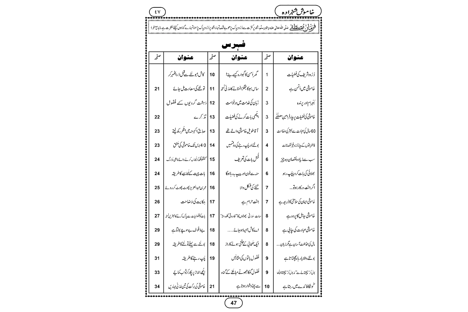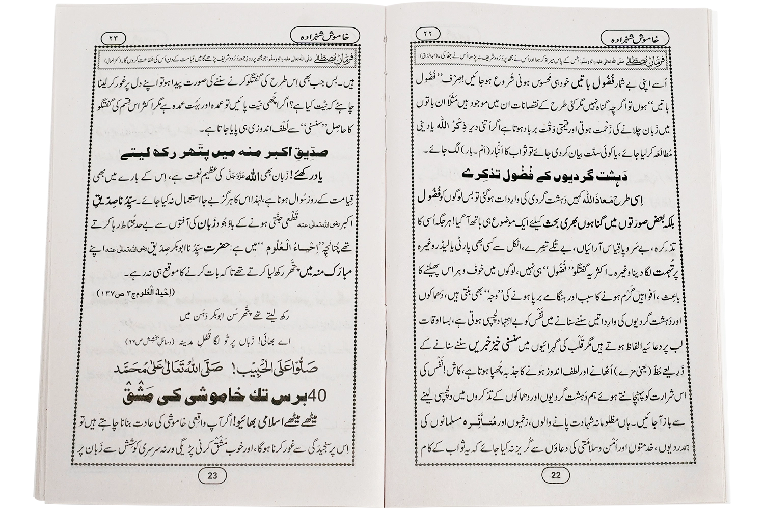 "خاموش شہزادہ" ایک اہم اسلامی رسالہ ہے جس کا موضوع زبان ہے۔ یہ رسالہ نبی اکرم ﷺ کی حیاتِ طیبہ کے ایک ایسے پہلو پر روشنی ڈالتی ہے جو ہمارے معاشرے میں اکثر نظر انداز ہو جاتا ہے، یعنی خاموشی اور اس کی اہمیت۔ یہ رسالہ اس بات کی طرف رہنمائی کرتاہے کہ نبی اکرم ﷺ کی سنت کے مطابق خاموشی اختیار کرنا کیسے انسان کی زندگی میں سکون، امن، روحانیت اور تعلقات میں بہتری کا باعث بنتا ہے۔ نیزیہ رسالہ بتاتا ہے کہ غفلت اور گناہوں پر مشتمل باتوں کو ترک کرکے اختیار کی جانے والی خاموشی دنیا و آخرت میں کامیابی کی کنجی ہے۔اس رسالےمیں اس بات پر زور دیا گیا ہے کہ بے جا گفتگو اور غیر ضروری باتوں سے بچ کر انسان نہ صرف اپنا وقار بلند کر سکتا ہے بلکہ معاشرتی برائیوں سے بھی محفوظ رہ سکتا ہے۔ اس رسالے میں نبی کریمﷺ کی خاموشی کے مختلف واقعات اور احادیث کی روشنی میں یہ بیان کیا گیا ہے کہ خاموشی کو اپنانا کیسے ایک مسلمان کے لیے باعثِ خیر ہے۔ اس کے علاوہ، یہ رسالہ بتاتا ہے کہ کس طرح غیر ضروری گفتگو سے اجتناب اور سوچ سمجھ کر بولنے کی عادت اپنانے سے انسان کی روحانی ترقی ممکن ہے۔ "خاموش شہزادہ" ایک ایسارسالہ ہے جو قارئین کو نبی ﷺ کی سیرت کے اس اہم پہلو کو سمجھنے اور اپنی عملی زندگی میں نافذ کرنے کی ترغیب دیتاہے۔ یہ رسالہ ہر مسلمان کے لیے ایک بہترین تحفہ ہے خصوصاً ان لوگوں کے لیے جو اپنی زندگی میں امن، سکون، اور روحانی ترقی چاہتے ہیں۔