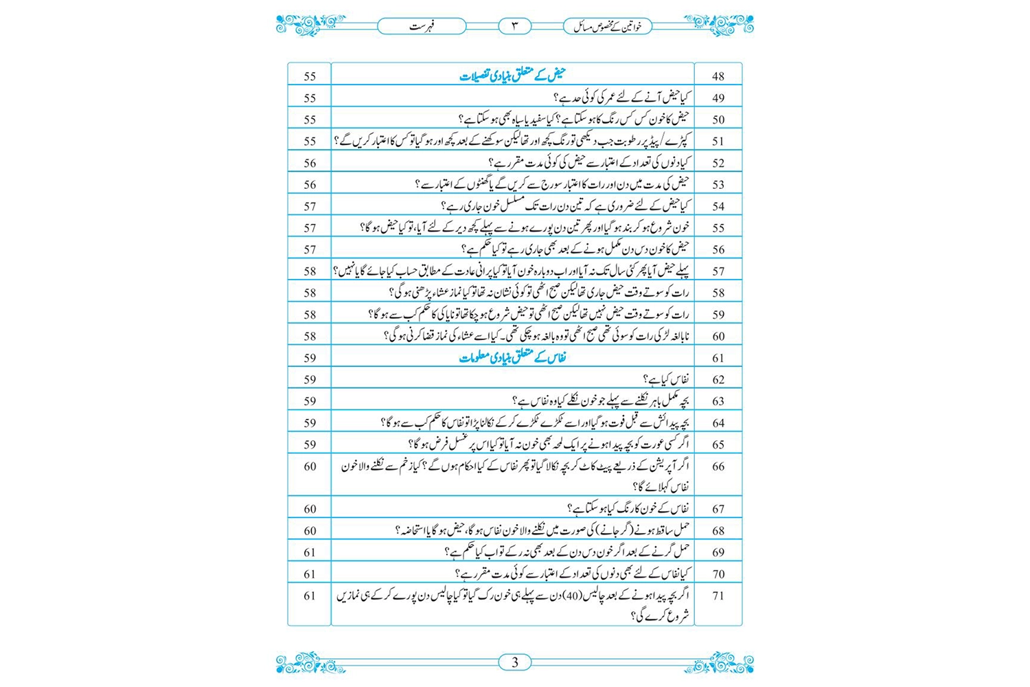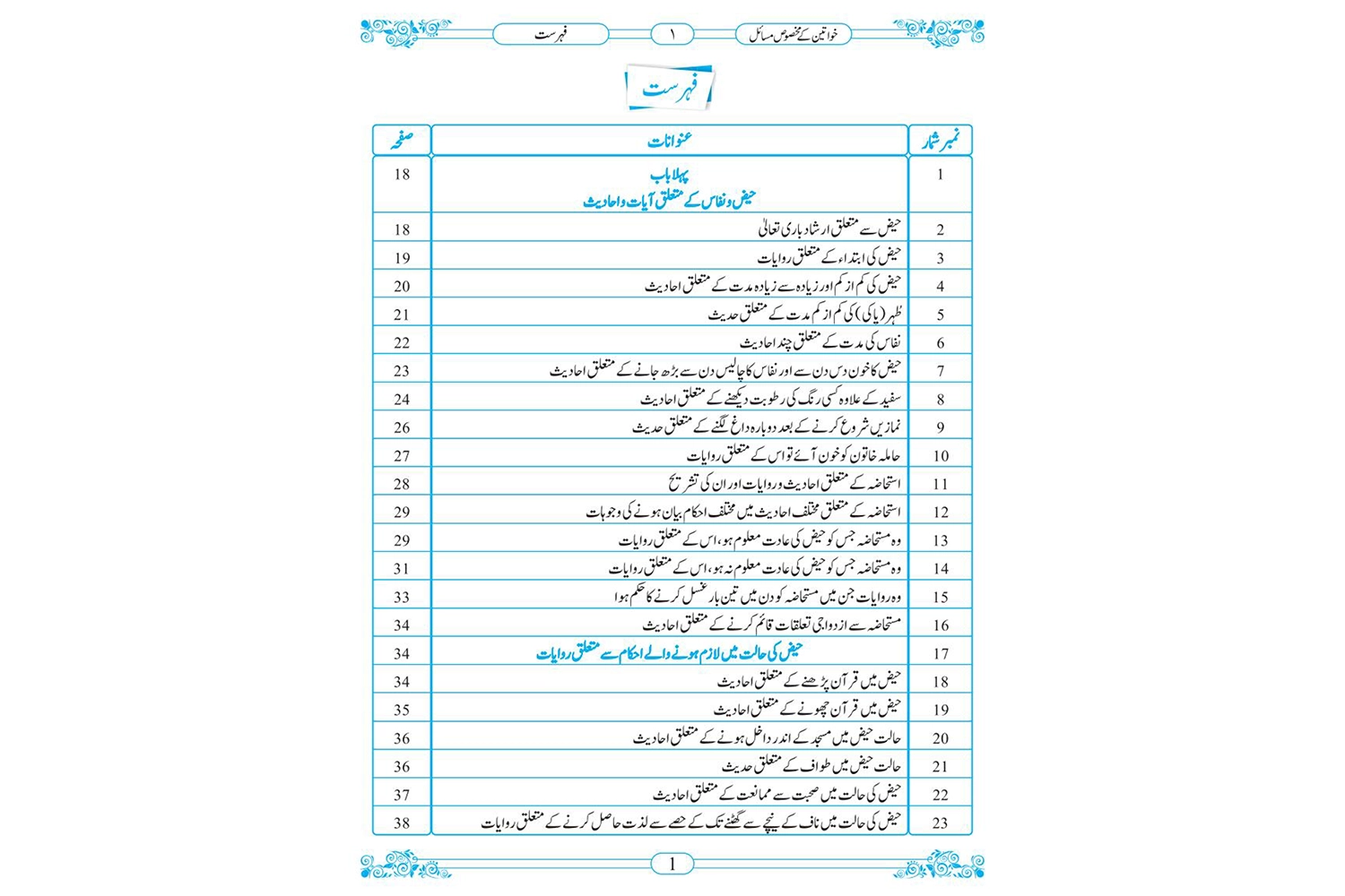 کتاب’’خواتین کے مخصوص مسائل ‘‘میں عورتوں سے متعلق پاکی و ناپاکی کے احکام و مسائل کو بہت آسان اور تفصیلی انداز میں بیان کیا گیا ہے۔یہ کتاب دو(2) ابواب (Chapters) اور ایک خاتمے پر مشتمل ہے ۔ پہلے باب میں حیض و نفاس اور استحاضہ سے متعلق احکامات پر آیات و احادیث ذکر کی گئی ہیں ۔ دوسرا باب چھ فصلوں پر مشتمل ہے ۔پہلی فصل میں حیض ،نفاس اور استحاضہ کے بارے میں بنیادی معلومات ہیں۔دوسری فصل میں حیض ونفاس کی مختلف صورتیں اور احکام ہیں۔تیسری فصل میں حیض ونفاس ختم ہونے کے متعلق احکام ہیں۔چوتھی فصل میں خون کے لگاتار جاری رہنے کے مسائل ہیں۔پانچویں فصل میں ایسی عور ت کے احکام بیان کیے گئے ہیں جو اپنی عادت کے ایام بھول گئی ہو۔ اور چھٹی فصل میں حیض و نفاس کے مشترکہ احکامات بیان کیے گئے ہیں جو کل آٹھ ہیں۔ خاتمے میں حیض کی عادت میں تبدیلی کو مثالوں سے واضح کیا گیا ہے ۔ خواتین کے مخصوص مسائل پر یہ کتاب مختصر ، جامع اور اپنی مثال آپ ہے ۔صرف اس ایک کتاب کے مطالعے سے خواتین اپنے اکثر ضروری مسائل سے آگاہ ہوجائیں گی۔یہ کتاب تمام خواتین کی بنیادی ضرورت ہے بالخصوص نوجوان لڑکیوں کی ۔ماؤں کو اور اساتذہ کو چاہیے کہ وہ اپنی بیٹیوں اور طالبات کو اس کتاب کا مطالعہ ضرور کروائیں۔