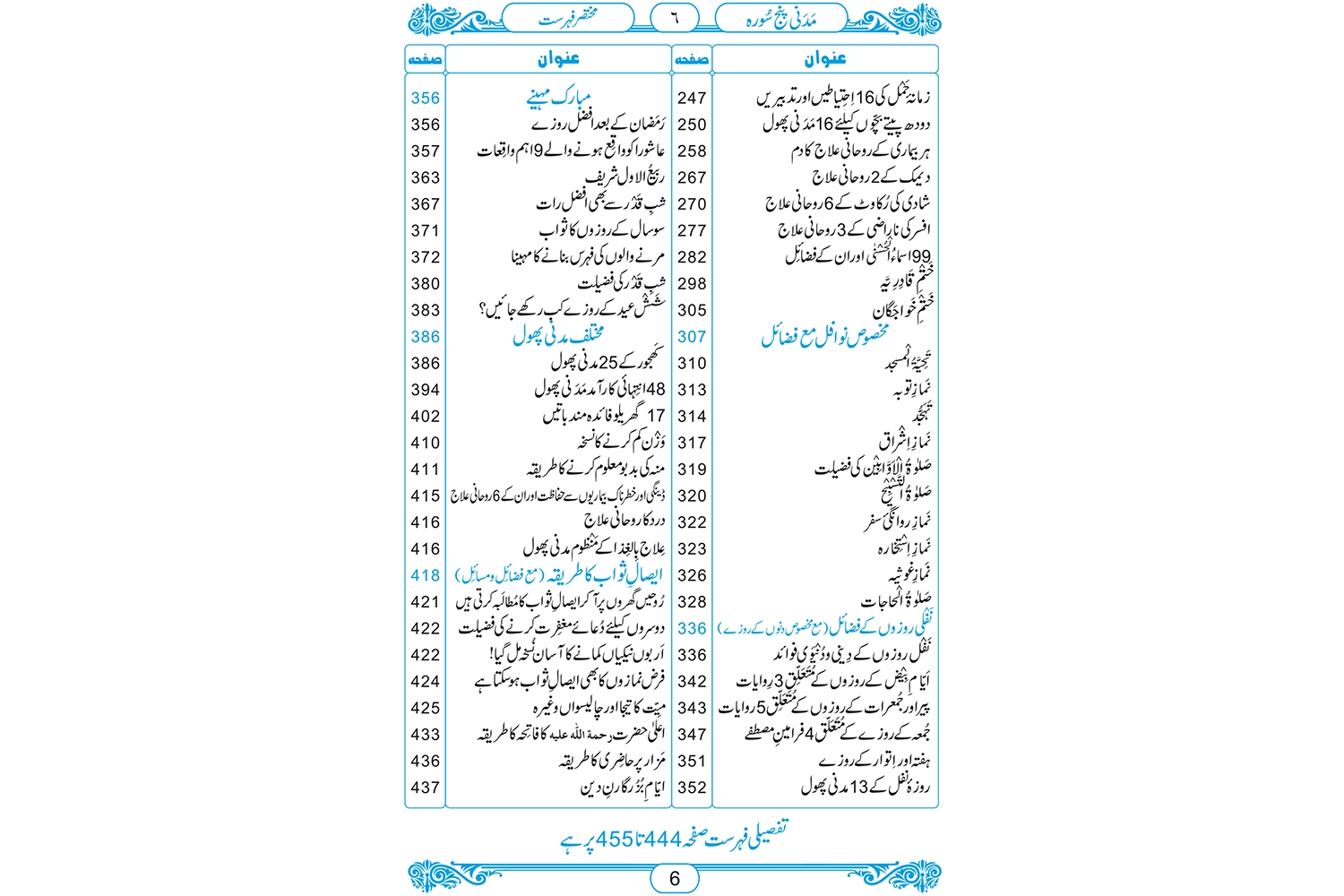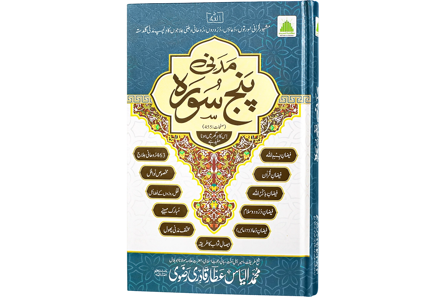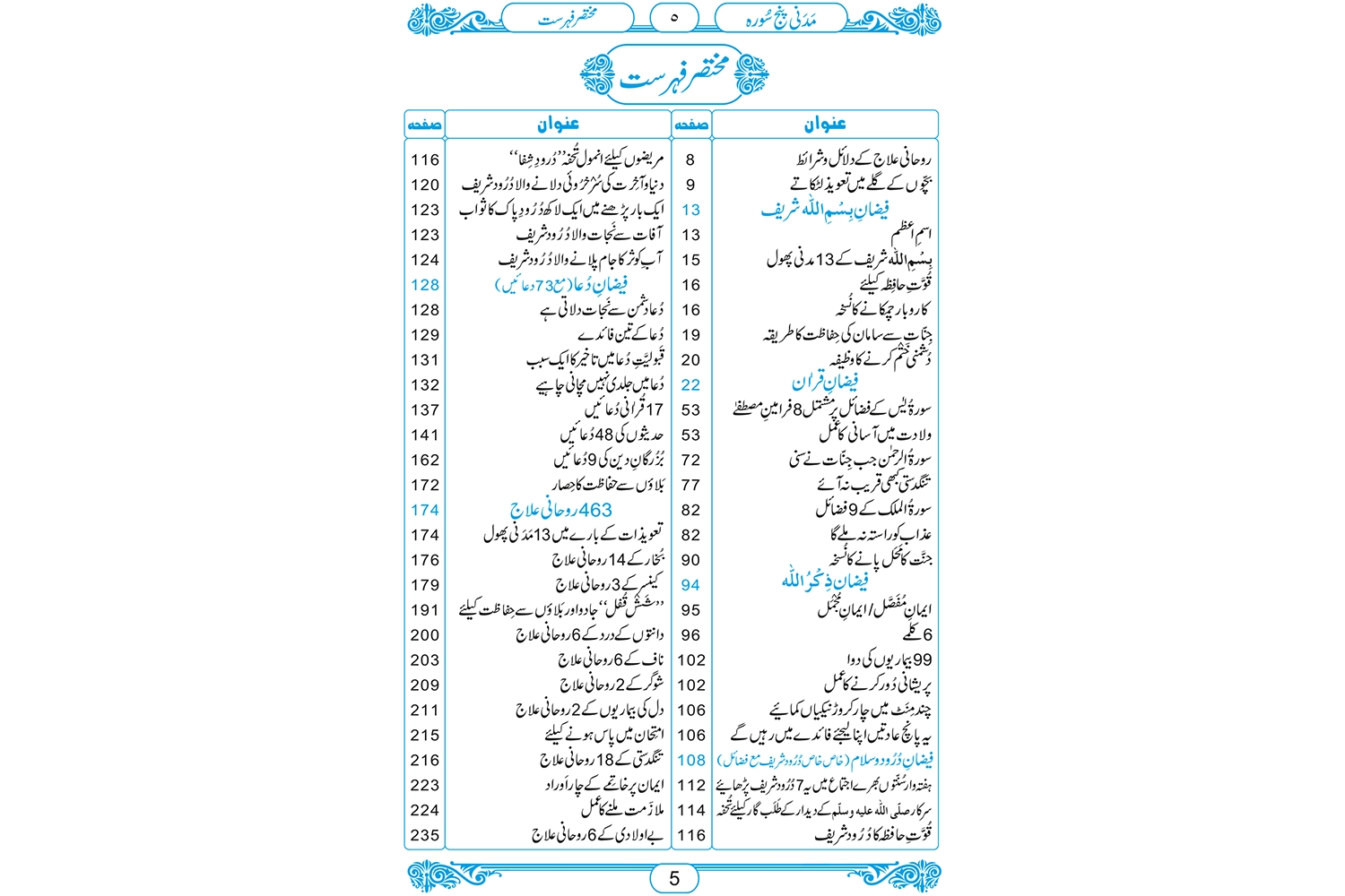 ’’مدنی پنج سورہ‘‘ مشہور قرآنی سورتوں ،درودوں ،روحانی وطبی علاجوں کا دل چسپ مجموعہ ہے ۔ یہ کتاب دس مضامین پر مشتمل ہے۔ فیضان بسم اللہ،فیضان قرآن،فیضان ذکر اللہ ،فیضان درود وسلام، فیضان دعا ،463 روحانی علاج ،مخصوص نوافل مع خصوصی فضائل،نفلی روزوں کے فضائل ،مبارک مہینے ،مختلف مدنی پھول اور ایصال ثواب کا طریقہ۔ اس کتاب میں مستند احادیث مبارکہ اور روایات سے مختلف قرآنی سورتوں اور آیات کے فضائل ذکر کیے گئے ہیں اور ان سورتوں اور آیات کے ذریعے ذاتی ، معاشی ،معاشرتی ، گھریلو ،،ازدواجی اور روحانی مسائل کے حل بتائے گئے ہیں ۔ قرآنی سورتوں اور آیات کے ذریعے مسائل کے حل کر نے کے طریقے یعنی اورادو وظائف کی ادائیگی کو بہت آسان انداز میں بیان کیا گیا ہے۔ اس کتاب میں مخصوص آیات کے ذریعے ان جسمانی بیماریوں کے روحانی علاج بھی مذکور ہیں جن کے علاج میں لاکھوں روپے لگ جاتے ہیں یا بعض اوقات انہیں لاعلاج قرار دے دیا جاتا ہے۔ اس کتاب میں نبی کریم ﷺ کی احادیث مبارکہ سے 48 دعائے ماثورہ بھی شامل کی گئی ہیں تاکہ مسلمان ان دعاوں کو اپنی زندگی میں شامل کر سکیں او ر ان سے دینی اور دنیاوی فوائد اٹھا سکیں ۔ اس کتا ب میں مختلف اسلامی مہینوں اور ایام کے فضائل اور اعمال بھی ذکر ہیں تا کہ انہیں جان کر مسلمان ان بابرکت ایام کو فضول کاموں میں گزارنے سے بچیں اور ان دنوں کے خاص اوراد و وظائف پڑھ کر دینی و دنیاوی برکات حاصل کر سکیں ۔یہ کتاب ہر گھر کی ضرورت ہے۔