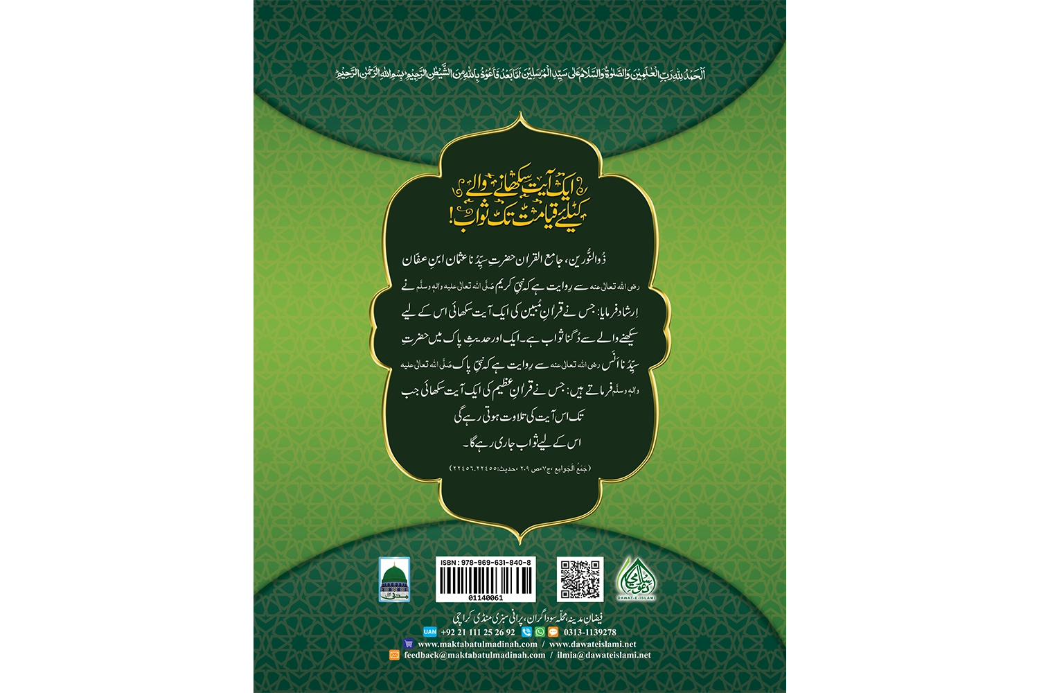 قرآن مجید اللہ تعالی کی مبارک کتاب ہے۔ اس کتاب کا پڑھنا، پڑھانا ، سننا اور سنانا سب ثواب کا کام ہے۔ قرآن پاک کا ایک حرف پڑھنے پر 10 نیکیوں کا ثواب ملتا ہے۔ نبی کریم ﷺ نے فرمایا: جو شخص کتاب اللہ کا ایک حرف پڑھے گا، اُس کو ایک نیکی ملے گی جو دس کے برابر ہوگی میں یہ نہیں کہتا ''الم'' ایک حرف ہے، بلکہ الف ایک حرف، لام ایک حرف اور میم ایک حرف ہے۔ (سنن الترمذی) قرآن پاک کی تلاوت کرنے کے لیے ضروری ہے کہ اسے صحیح اعراب اور تلفظ کے ساتھ پڑھا جائے ۔ اسی ضرورت کے پیشِ نظر مکتبۃ المدینہ پیش کر رہا ہےقرآن پاک ورژن NI-12 جس کی درج ذیل خصوصیات ہے: • اس قرآن پاک کا سائز بڑا ہے جسے بچے اور بوڑھے بآسانی پڑھ سکتے ہیں۔ • الفاظ بڑے بڑے اور کھلے انداز میں لکھے گئے ہیں تا کہ تلاوت کے وقت غلطی کا امکان کم سے کم ہو۔ • کاغذ (Paper)سفید رنگ کا اورعمدہ کوالٹی کا استعمال کیا گیا ہے تا کہ تلاوت میں آسانی ہو۔ • بائنڈنگ مضبوط ہے۔ • پکڑنے اور اٹھانے میں وزن بہت کم ہے۔ اس قرآن پاک کے آغازمیں تلاوت ِ قرآن کے فضائل بھی شامل کیے گئے ہیں تا کہ پڑھنے والوں کو زیادہ سے زیادہ تلاوت کا شوق پیدا ہو۔ یہ قرآن پاک ہر گھر اور مدرسہ کی ضرورت ہے۔ اس قرآن پاک کو آپ اپنے مرحوم عزیز و اقارب کے لیے صدقہ جاریہ کے طور پر مساجد اور مدارس میں بھی رکھوا سکتے ہیں