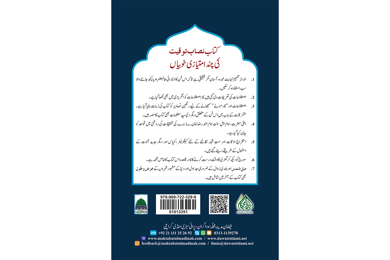 "نصاب توقیت" دعوت اسلامی کے شعبہ توقیت کی ایک اہم اور مفید کتاب ہے جو علم توقیت کے اصول و قوانین کو جدید تقاضوں کے مطابق پیش کرتی ہے۔ علم توقیت وہ علم ہے جس کے ذریعے نمازوں کے اوقات کی تعیین، سمت قبلہ کی درستی اور دیگر فلکیاتی امور کی پیمائش کی جاتی ہے۔ یہ کتاب خاص طور پر ان لوگوں کے لیے ترتیب دی گئی ہے جو اس علم میں ابتدائی مراحل میں ہیں یا جو اس کے بنیادی اصولوں کو سمجھنا چاہتے ہیں۔ کتاب کا انداز تفہیم نہایت عمدہ اور تحقیقی ہے، جس سے ہر سطح کے قارئین استفادہ کر سکتے ہیں۔ اس میں استعمال ہونے والی اصطلاحات (Terminologies) کو انگریزی (English) میں بھی لکھا گیا ہے۔کتاب میں مختلف اصطلاحات اور فارمولوں (Formulas) کو سمجھانے کے لیے رنگین تصاویر (Colored Images) کا بھی استعمال کیا گیا ہے، جس سے قارئین کو بصری مدد حاصل ہوتی ہے۔ کتاب میں اعلیٰ حضرت امام احمد رضا خان بریلوی رحمۃ اللہ علیہ کی تحقیقات کی روشنی میں علم توقیت کے اصولوں کو بیان کیا گیا ہے، جو اس فن کی علمی بنیادوں کو مضبوط کرتا ہے۔ اس کے علاوہ، استخراج اوقات (Calculation of Prayer Times) اور سمت قبلہ نکالنے کے لیے کیلکولیٹر (Calculator)، کمپاس (Compass)، اور دیگر جدید آلات کے استعمال کے طریقے بھی بتائے گئے ہیں۔ ایک نادر قاعدہ جو اس کتاب میں شامل ہے، وہ سورج کو دیکھ کر گھڑی کا وقت درست کرنے کا طریقہ ہے۔ کتاب کے آخر میں دنیا کے مشہور شہروں کے طول و عرض کے جدول (Tables of Latitude and Longitude) اور بلدی زوال (Local Noon) کے ضروری اعداد و شمار بھی شامل کیے گئے ہیں، جو اس کتاب کو جامع بناتے ہیں اور ماخذ (Reference) کی حیثیت دیتے ہیں۔ "نصاب توقیت" اپنے موضوع پر ایک بہترین اور مکمل رہنما کتاب ہے، جو علم توقیت کے میدان میں دلچسپی رکھنے والے ہر فرد کے لیے انتہائی مفید ہے۔