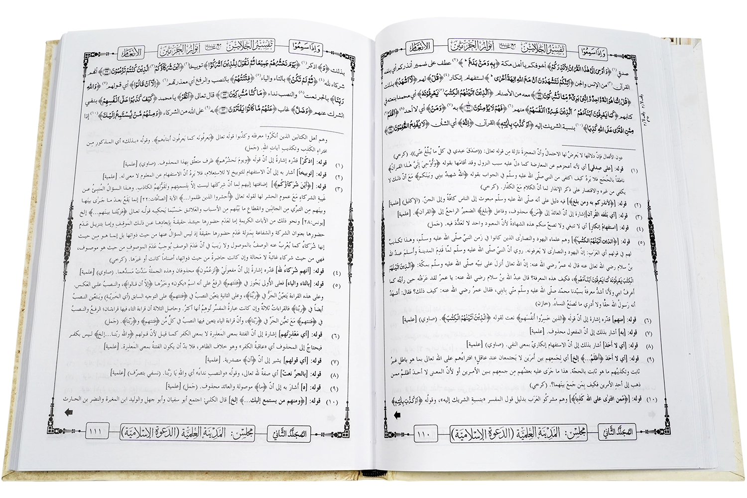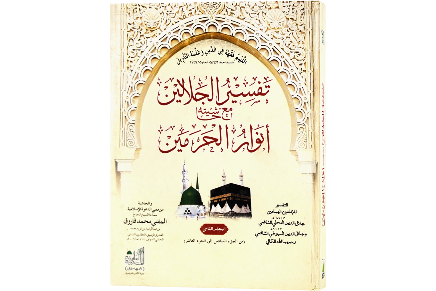 تفسیرِجلالین وہ عظیم الشان عربی تفسیر ہےجو عرصۂ دراز سے درسِ نظامی(عالم کورس)کے نِصاب (Syllabus) میں شامل ہے۔اس تفسیر میں صحیح ترین اقوال ذِکْر کرنے کااہتمام کیا گیا ہے۔ کتاب تفسیرِ جلالین دو بزرگوں کی کاوش کانتیجہ ہے۔ جمہور (یعنی اکثر علما) کے قول کے مطابق سورۂ بَقَرَہ سے لیکر سورہ اِسْراء (یعنی سورۂ بنی اسرائیل) کے آخر تک حضرت سیِّدُنا امام جلال الدین عبدالرحمن سیوطی شافعی رحمۃ اللہ علیہ (متوفی 911ھ) نے جبکہ سورۂ کہف سےلیکر سورۂ و الناس تک بَشمول سورہ ٔفاتحہ کی تفسیرحضرت سیدنا امام جلال الدّین محمد محلی شافعی رحمۃ اللہ علیہ (متوفی864ھ) نے تحریر فرمائی ہے۔ امام محلی اور امام سیوطی کی علمی خدمات اور ان کے علمی معیار کو مدنظر رکھتے ہوئے، تفسیرِ جلالین کی وقعت میں بے حد اضافہ ہوجاتا ہے یہی وجہ ہے کہ یہ کتاب اسلامی علوم کے مستند اور قابلِ اعتماد ماخذوں میں شامل ہے۔اس کتاب کی یہ خصوصیت ہے کہ اس میں قرآن کی تشریح کو واضح اور سادہ انداز میں پیش کیا گیا ہے، جس سے طلباء اور عام افراد کو قرآن کے معانی سمجھنے میں آسانی ہوتی ہے۔ • مکتبۃ المدینہ کی شائع کردہ اس تفسیر جلالین کی خصوصیات: • مکتبۃ المدینہ نے اس تفسیر جلالین کو جدید خطوط پر شائع کیا ہے۔ • ایک بہت مفید حاشیہ بنام "انوار الحرمین " کا اضافہ کیا گیا ہے۔ • مفسر اور محشی کا تعارف بھی دیا گیا ہے۔ • اغراضِ مفسر کو حتی الامکان بیان کیا گیا ہے۔ • احناف کے مفتی بہ اقوال کی حاشیہ میں وضاحت کی گئی ہے۔ • اعلی حضرت امام اہلسنت امام احمد رضا خان علیہ الرحمہ کی تحقیق کو بھی جگہ جگہ ذکر کیا گیا ہے۔ • مشکل الفاظ پر اعراب کا اہتمام کیا گیا ہے۔ • رسم عثمانی کا التزام کیا گیا ہے۔ مکتبۃ المدینہ کی شائع کردہ تفسیر جلالین کی یہ پہلی جلد جس میں صرف پانچ سپارے ہیں۔